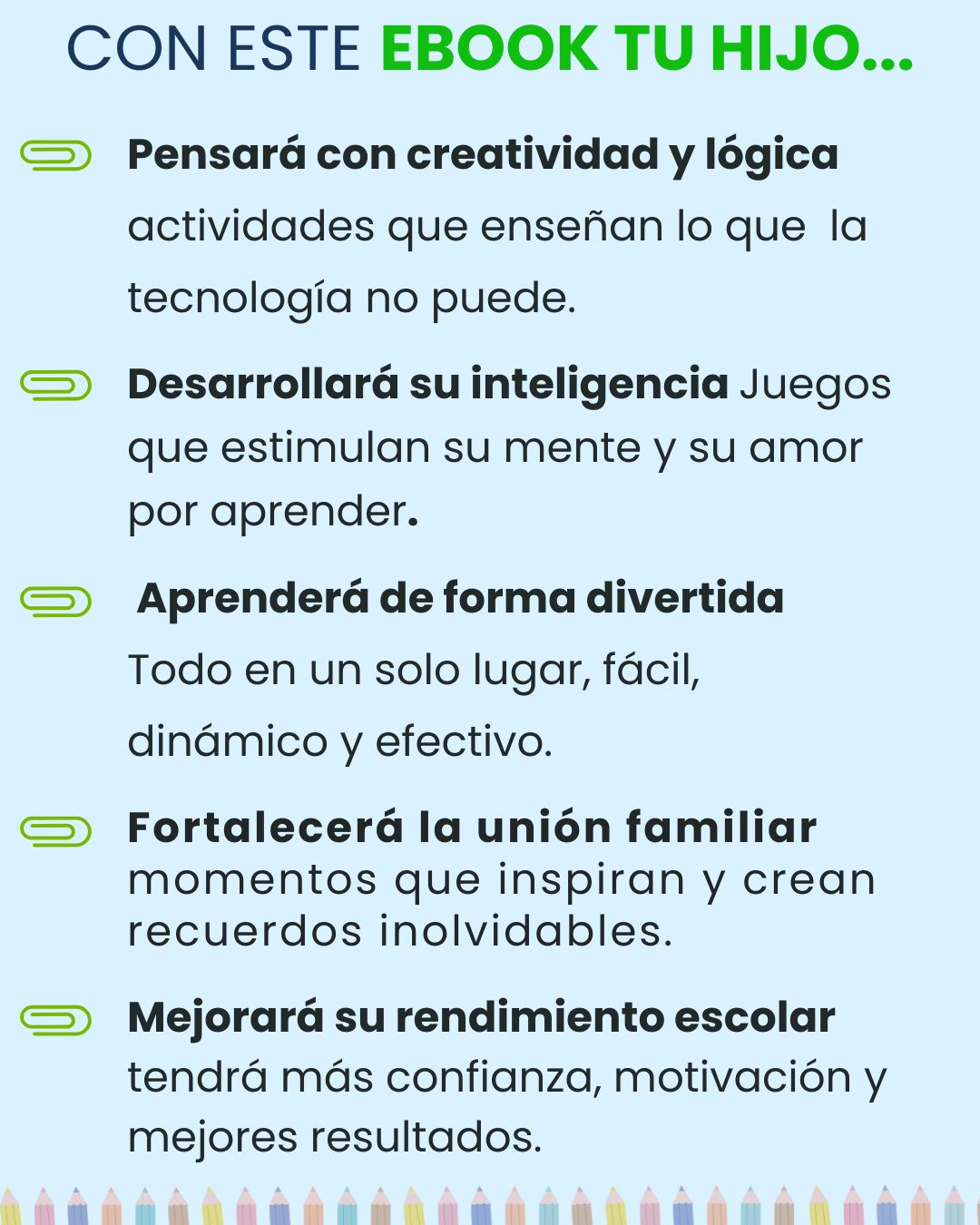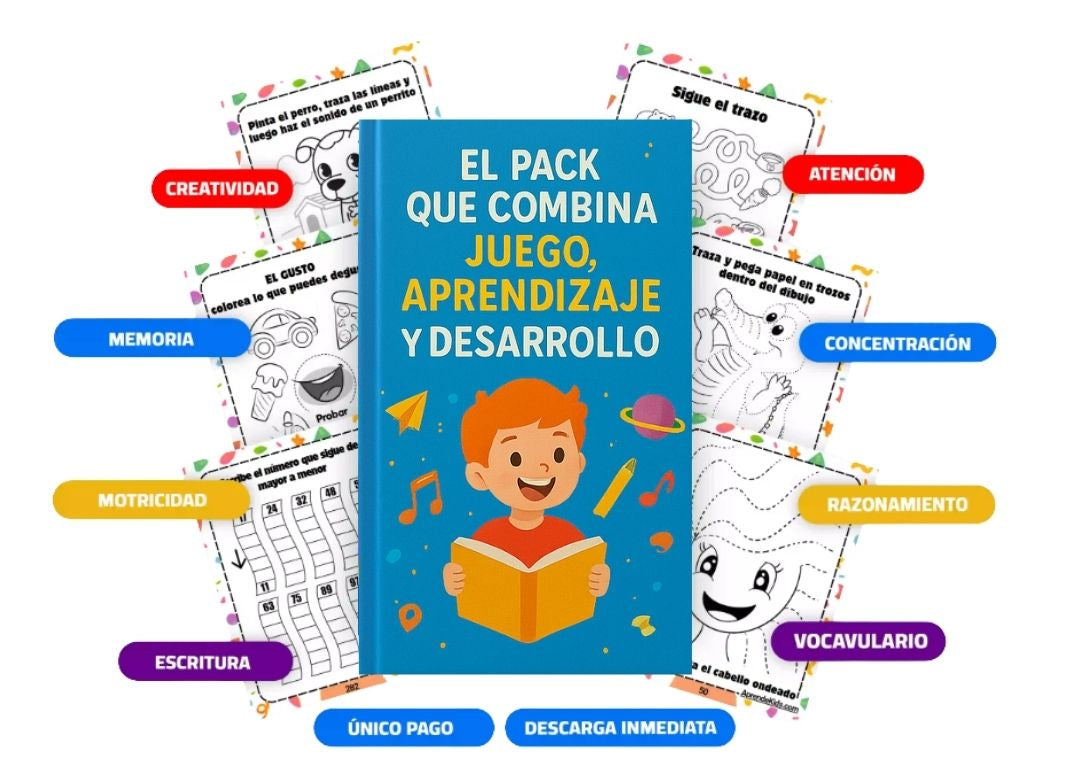 Incluye actividades imprimibles diseñadas para que los peques aprendan jugando: trazos, letras, números, juegos de atención, memoria y desafíos creativos. Todo pensado para estimular la mente, la motricidad y la concentración, ¡sin pantallas!
